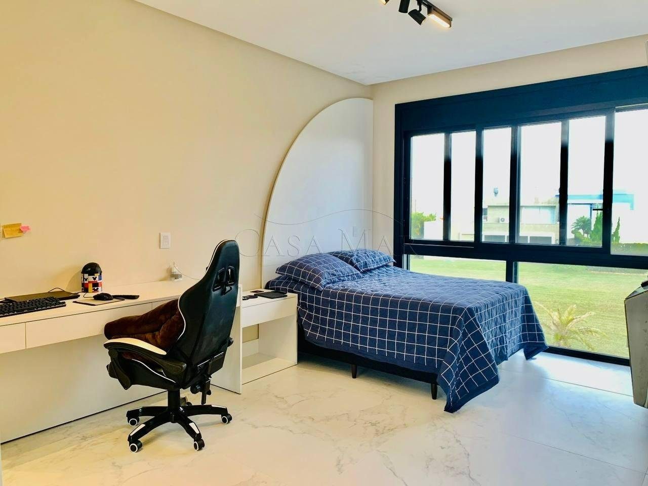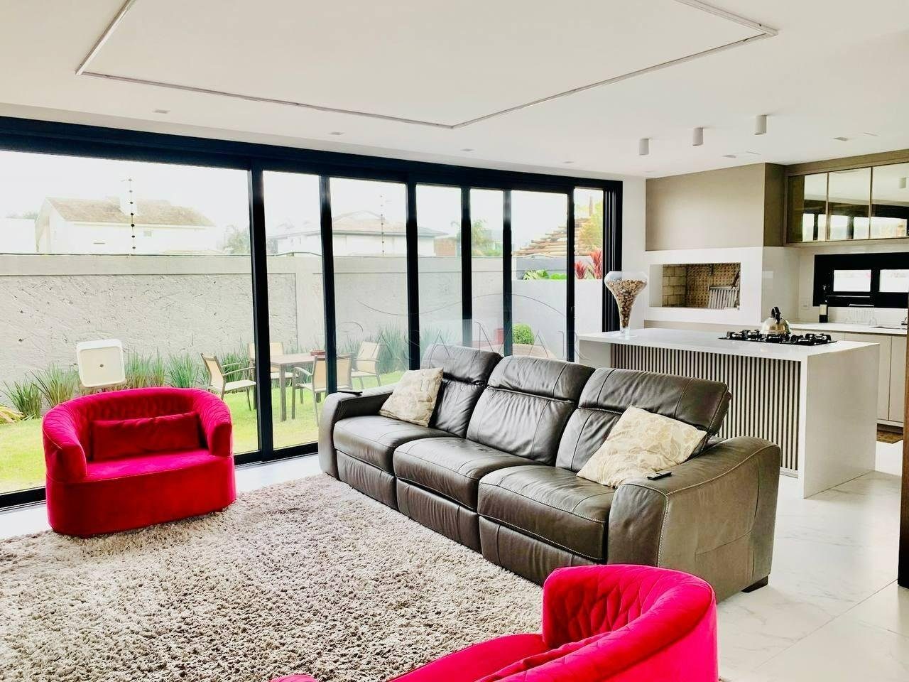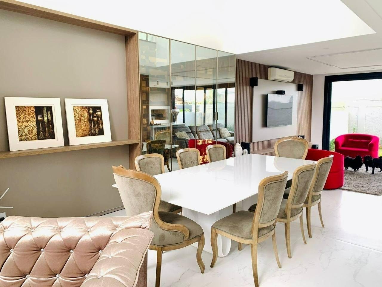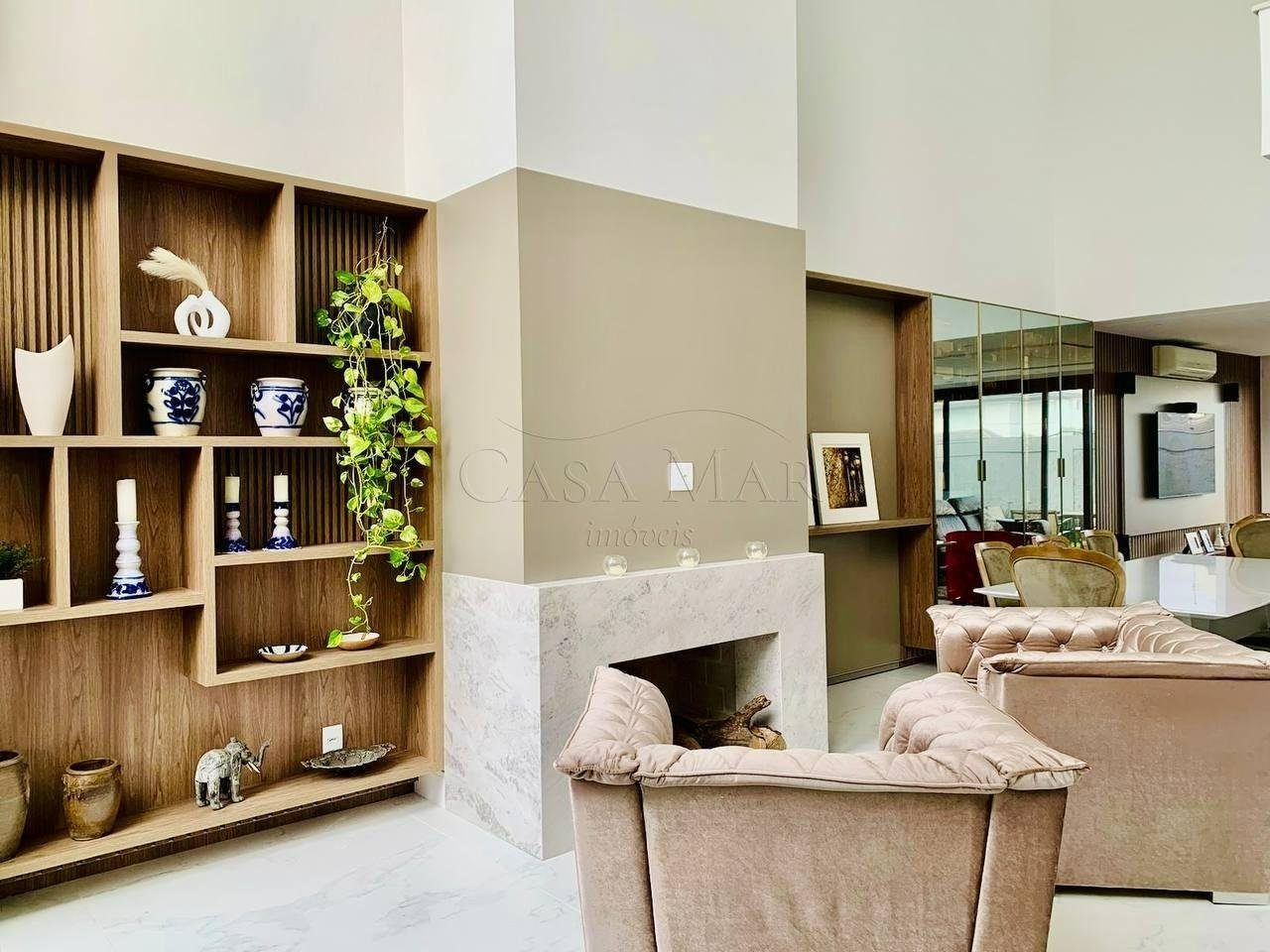 Composto por 04 suítes, sendo 01 térrea e 01 master, living em 02 ambientes com lareira, cozinha americana, churrasqueira, lavabo, área de serviço, varanda, pátio amplo, paisagismo e abrigo para carros.