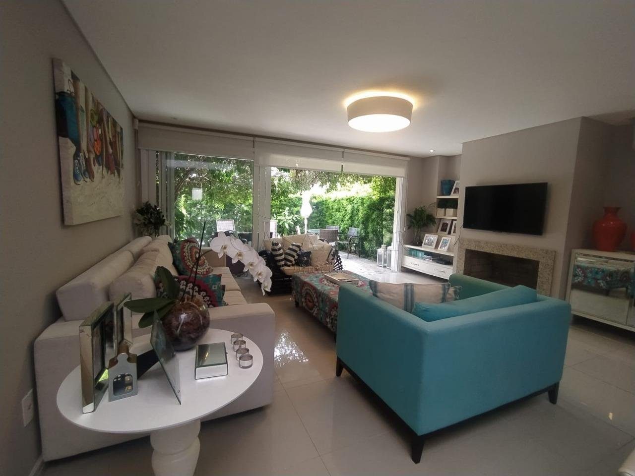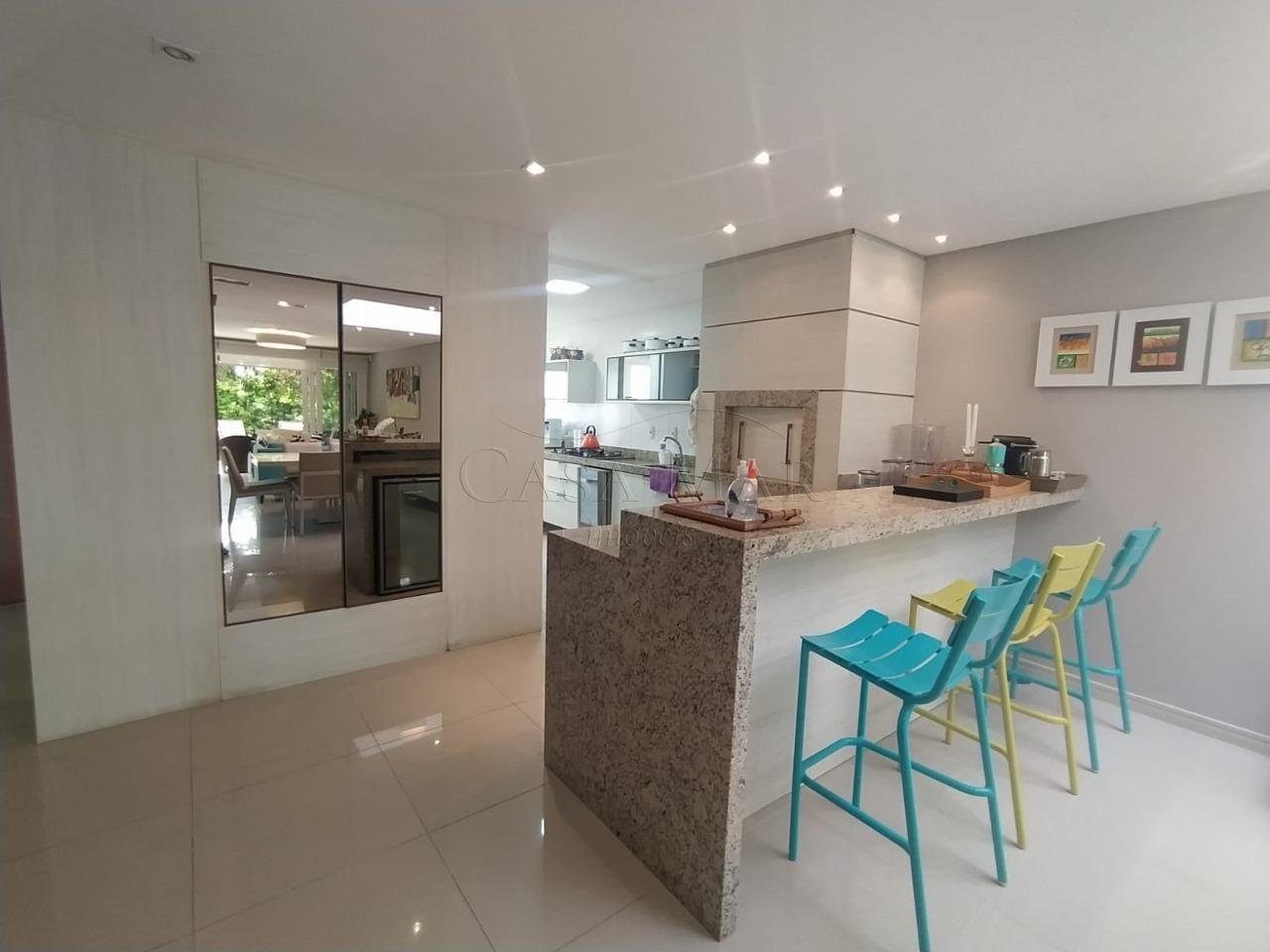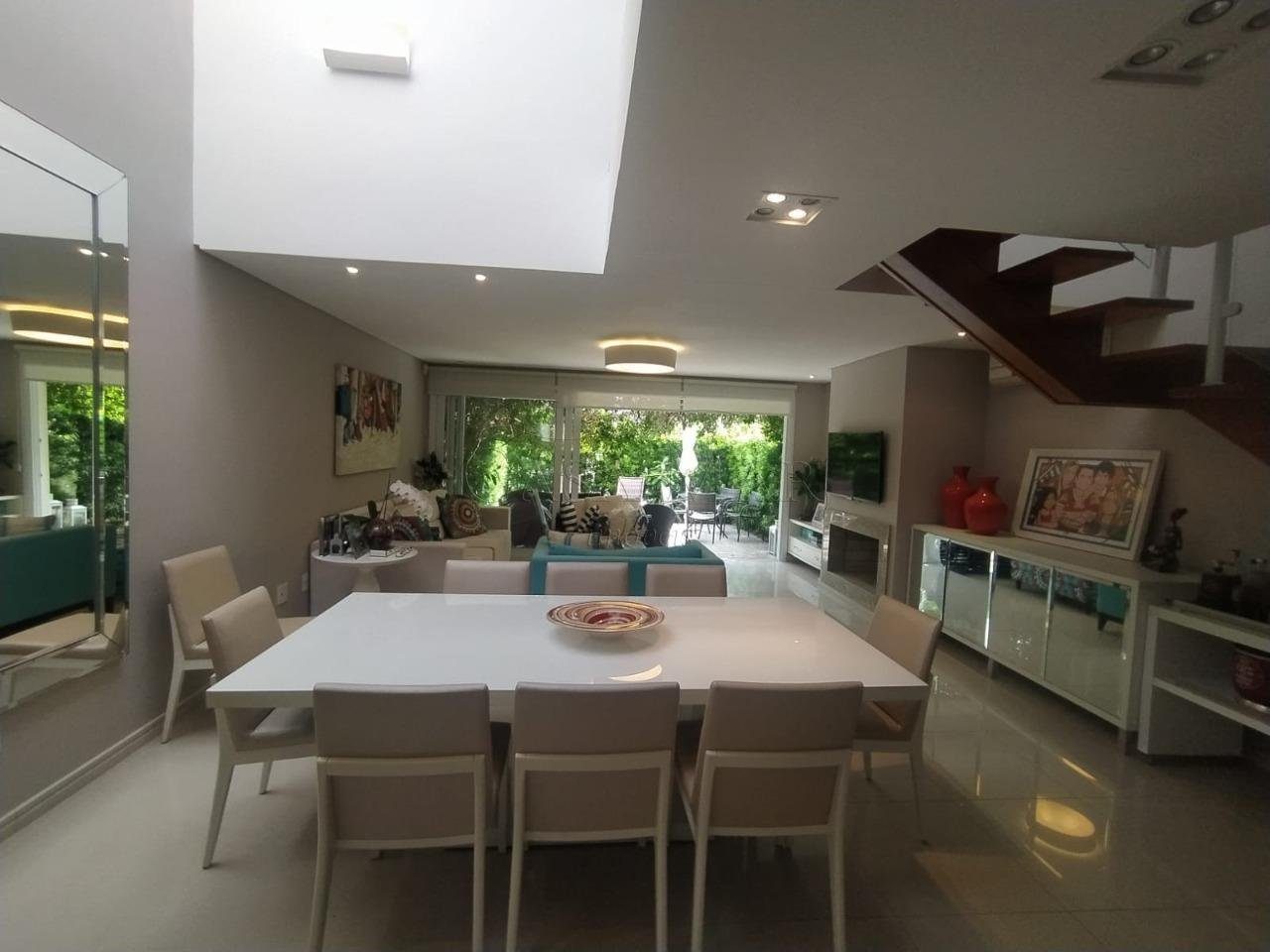 Sobrado mobiliado e decorado composto por 03 suítes, living em 03 ambientes com lareira, lavabo, cozinha americana com churrasqueira, área de serviço e 02 vagas para carro.
